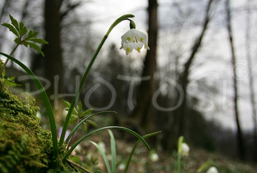 : Spring snowflake flowers are growing on edge of forest near village small village Brdo, Slovenia. Spring Snowflake which is also known as St. Josephs Bells (Leucojum vernum) is early spring flower which gives sign to people that winter is definitely over.
