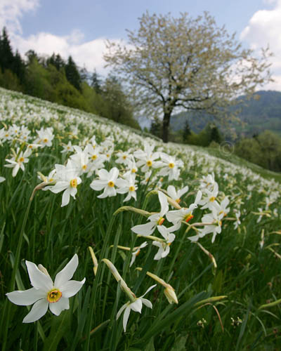 : Daffodil flowers (Narcissus poeticus) are starting to bloom on meadows under Golica, Slovenia. Meadows under Golica, Slovenia, are famous for their carpets of daffodil flowers which start to bloom in begining of May. Daffodil flowers cover all grass fields on hills and valleys of meadows under mountain Golica above Jesenice, Slovenia.