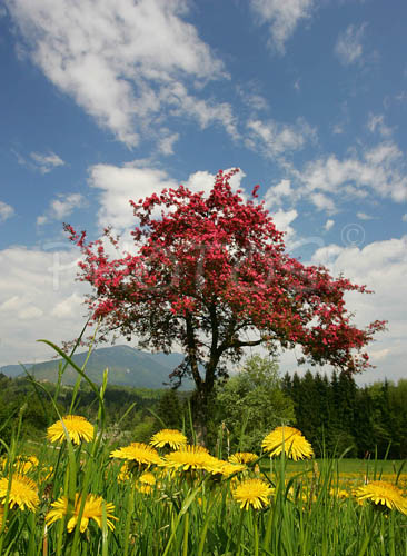 : Dandelion flowers (Taraxacum officinale) are blooming on grass fields near village Brdo, Slovenia. In May fields near village Brdo, Slovenia, turn yellow from blooming dandelion flowers while apple, pear and peach trees start too bloom in white and red, making perfect colorfull combination with yellow dandelion flowers and bright green grass.