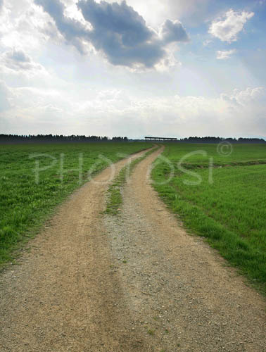 : Path is leading through grass fields near village Lahovce, Slovenia. Fields finally turned into green color after long expected spring finally came to villages around Kranj, Slovenia.
