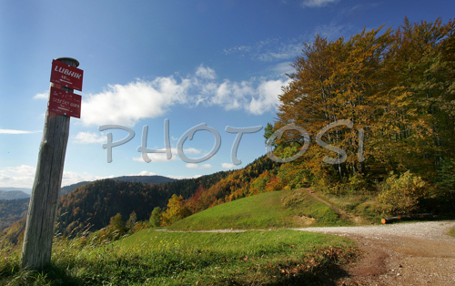 : White dot with red border is mark for mountain paths leading through forest and mountains across Slovenia. In early fall morning this marks are often only signs directing keen mountaineers from valley up to hills. When fog is still covering most of lower laying landscape, top of hills are already glowing in colorfull fall colors which are even more glowing due cold weather in last few days.