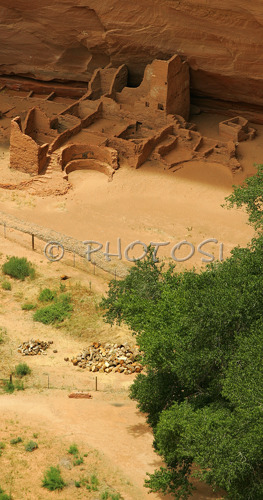 : Ruins of Antelope house bellow in Canyon de Chelly. Canyon de Chelly National Monument is located near Chinle, AZ, USA and is hiding numerous house ruins of Navajo Indians, which were settled in Canyon de Chelly. Labyrinth called Canyon de Chelly is really several canyons, which include Canyon de Chelly and Canyon del Muerto. At the mouth of the canyon the rock walls are only 30 feet high. Deeper into the canyons, to the east, the walls rise dramatically until they reach more than 1000 feet above the floor. The cliffs rise straight up, overshadowing the streams, cottonwoods, and small farms below. It has taken about two million years and volumes of water to etch these stone paths through the layers of sandstone and igneous rock as the Defiance Plateau pushed its way upward. Today the canyon still beckons us with its towering stone monoliths and ledges bearing the open windows of ancient people.