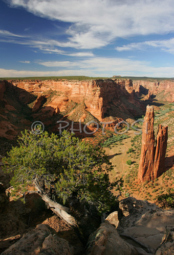 Canyon de Chelly National Monume ,USA - 26.06.2007 : Spider rock is an 800 foot sandstone spire that rises from the canyon floor at the junction of Canyon de Chelly and Monument Canyon. Labyrinth called Canyon de Chelly is really several canyons, which include Canyon de Chelly and Canyon del Muerto. At the mouth of the canyon the rock walls are only 30 feet high. Deeper into the canyons, to the east, the walls rise dramatically until they reach more than 1000 feet above the floor. The cliffs rise straight up, overshadowing the streams, cottonwoods, and small farms below. It has taken about two million years and volumes of water to etch these stone paths through the layers of sandstone and igneous rock as the Defiance Plateau pushed its way upward. Today the canyon still beckons us with its towering stone monoliths and ledges bearing the open windows of ancient people. Photo by: Primoz Jeroncic/PhotoSI