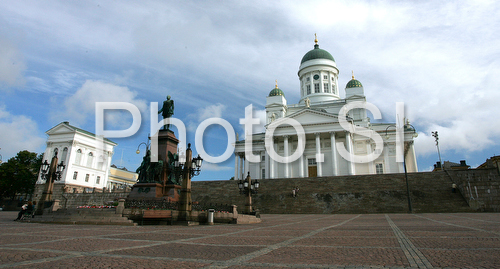: Lutheran cathedral in Helsinki, Finland, is dominating Senate Square with statue of Russian tsar Alexander II.
