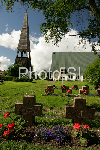 : Church and small graveyard in remembrance of Winter War in village of Suomussalmi, Finland. One of the most famous early battles of the Winter War occurred at Suomussalmi during December, 1939. The Russian 44th Division advanced along the Raate Road from the south and the 163rd Russian Division advanced from Juntusranta from the North. They were supposed to link up at Suomussalmi and then head West across Finland to Oulu and cut the country in half.