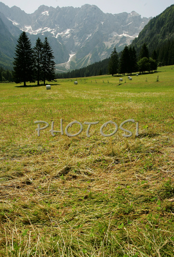 : Jezersko with one of its valleys, Ravenska Kocna, under high mountains of Grintovec in early summer day. Grass is freshly cut, and high altitude makes summer day with hot temperatures bearable.