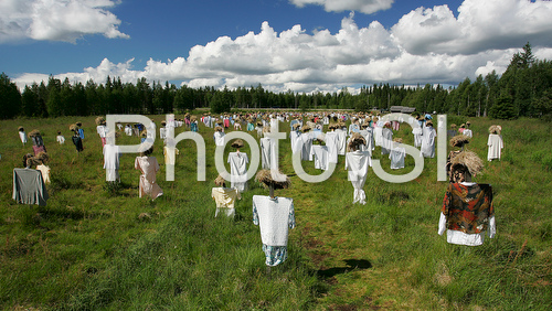 : The Silent People. The almost one thousand strong band that makes up the Silent People suddenly emerges before the passing motorist like some great stroke of magic. In the morning wih he light behind them, this motionless army appears morose, even menacing. However, as the day progress their countenance brightens up and with the setting of the sun, they present a distinctly jolly and colorful picture. Finnish artist Reijo Kela unveiled his peat-headed beings for the first time in his 1988 presentation Ilmaris Ploughed Field in Lassilas Field. They reappeared six years later in Helsinkis Senaatintori Market Place as part of the 1994 Kainuu Exhibition. Some 1200 Silent people had made journey down to Helsinki, but there was room for only 700 of them on the steps of the Cathedral. The Silent People moved to their present home in autumn of 1994. he peat-heads are kept in good shape and have their clothing attended to twice a year. Their heads come straight from the field, their clothes come from organized collections. The Silent People are made and clothed by Suomussalmi Youth Workshop, which also takes care of their maintenance.