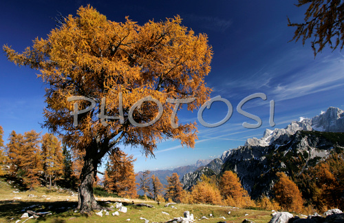 : Central Julian Alps with Skrlatica, Prisojnik, Kukova spica and Vrsic are seen from 1909m high Slemenova Spica. Fall brought first snow in mountains around Vrsic, Slovenia. Trees in mountains above Kranjska gora, Slovenia, painted their leaves into colorful fall colors, while first snow in mountains put some more contrast to already beautiful and peaceful landscape.