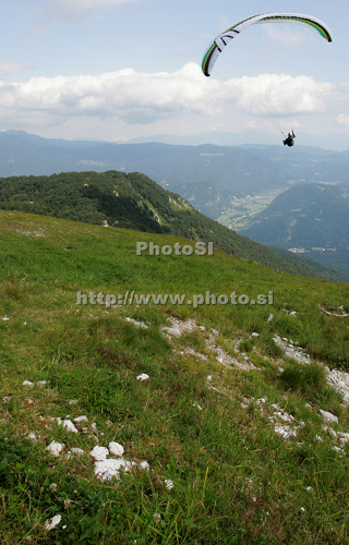 : Paragliders starting their flights from Vogel. Vogel is starting point of many hiking paths around Julian Alps and Triglav National Park in summer, and skiing resort in winter.