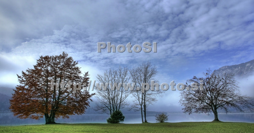 : Autumn dressed surrounding of Bohinj lake into beautiful fall colors. Lake Bohinj lies between Bohinjs mountains, which rise from 1600 to 2000 meters, and is Slovenias largest glacial lake. It is 4.2 kilometers long, one kilometer wide, and forty-five meters deep. Bohinj is a valley that stretches from Soteska to Ukanc. On the south side, it is enclosed by the Lower Bohinj Mountains, which rise to 2.000 meters, and on the north by the Triglav mountain range with 2864m high Mount Triglav, Slovenias highest mountain.