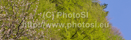 : Blooming trees and first green leafs are turning landscape into beautiful bright green carpet laid over spring ground near village Podljubelj, Slovenia.