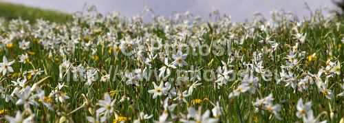 : Daffodil flowers (Narcissus poeticus) are starting to bloom on meadows under Golica, Slovenia. Meadows under Golica, Slovenia, are famous for their carpets of daffodil flowers which start to bloom in beginning of May. Daffodil flowers cover grass fields on hills and valleys of meadows under mountain Golica above Jesenice, Slovenia.