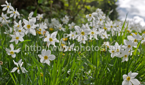 Golica ,Slovenia - 09.05.2010 : Daffodil flowers (Narcissus poeticus) are starting to bloom on meadows under Golica, Slovenia. Meadows under Golica, Slovenia, are famous for their carpets of daffodil flowers which start to bloom in beginning of May. Daffodil flowers cover grass fields on hills and valleys of meadows under mountain Golica above Jesenice, Slovenia. Photo by: Leena Jeroncic