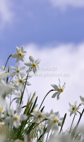: Daffodil flowers (Narcissus poeticus) are starting to bloom on meadows under Golica, Slovenia. Meadows under Golica, Slovenia, are famous for their carpets of daffodil flowers which start to bloom in beginning of May. Daffodil flowers cover grass fields on hills and valleys of meadows under mountain Golica above Jesenice, Slovenia.