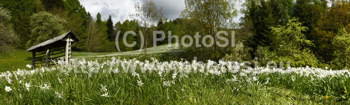 : Daffodil flowers (Narcissus poeticus) are starting to bloom on meadows under Golica, Slovenia. Meadows under Golica, Slovenia, are famous for their carpets of daffodil flowers which start to bloom in beginning of May. Daffodil flowers cover grass fields on hills and valleys of meadows under mountain Golica above Jesenice, Slovenia.