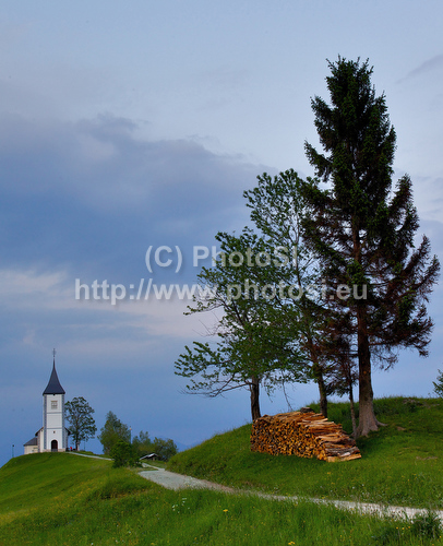 : Church of Saints Primus and Felician in Jamnik, Slovenia on late evening of 26th of May 2010, when sun was setting down behind plateu of Jelovica. Church is build on hill overlooking most of the northern part of the Ljubljana Basin with the Julian Alps as a backdrop towards the northwest and the Kamnik Alps towards the east.