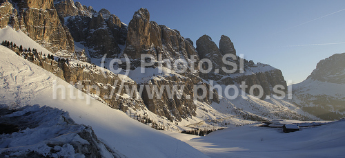 : Landscape with high Dolomite mountains around Gardena pass in Val Gardena, Italy on late winter evening of 11th of March 2011.