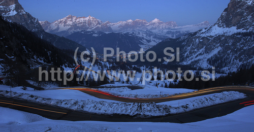 : Landscape with high Dolomite mountains around Gardena pass in Val Gardena, Italy on late winter evening of 11th of March 2011.