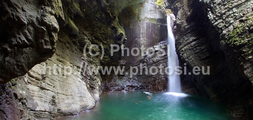 : Surrounding of Veliki Kozjak waterfall is calm and dark on early morning of Friday, 22nd of April 2011. The Kozjak brook, feeding the Soca river from the east, springs high beneath Mt. Krncica (2142 m), and runs through many pools making six waterfalls. One of Slovenia most picturesque waterfalls, the Veliki Kozjak, was created in the outlet of the lower Korita of the Kozjak Brook.