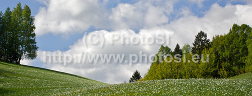| Title: | Daffodil flowers (Narcissus poeticus) are starting to bloom on meadows under Golica,