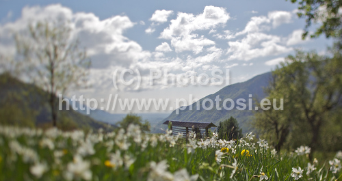 : Daffodil flowers (Narcissus poeticus) are starting to bloom on meadows under Golica, Slovenia. Meadows under Golica, Slovenia, are famous for their carpets of daffodil flowers which start to bloom in beginning of May. Daffodil flowers cover grass fields on hills and valleys of meadows under mountain Golica above Jesenice,
