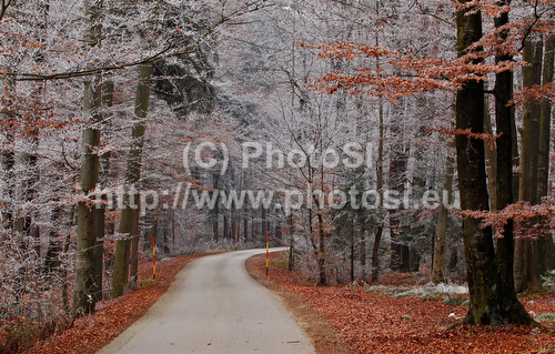 : Frost on trees around small village road near Ljubno, Slovenia. Days of fog and cold temperatures on lower parts of Slovenia, put trees and flowers into frost armour.