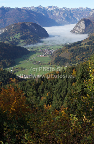 : Forest in autumn colors is rising above valley of Bohinj, Slovenia, which is still covered with thick morning fog. View over the valley from Vodnikov razglednik near village Koprivnik, Slovenia, is outstanding and it takes breath away on such sunny morning.
