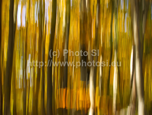: Forest in autumn colors is rising above valley of Bohinj, Slovenia, which is still covered with thick morning fog. View over the valley from Vodnikov razglednik near village Koprivnik, Slovenia, is outstanding and it takes breath away on such sunny morning.