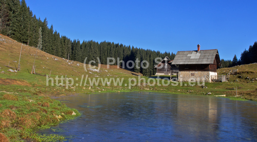 : Old shepherds houses on Kranjska dolina in Pokljuka. Winter and cold is slowly coming to meadows of Kranjska dolina in Pokljuka, Slovenia, on sunny and cold morning of Saturday, 17th of November 2012.
