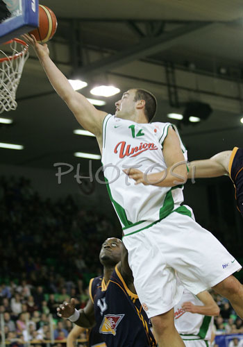 : Marko Milic (no. 12) of Union Olimpija scoring during match of Euroleague League between KK Union Olimpija, Ljubljana, Slovenia and Lottomatica Roma, Italy. Match ended with victory of Union Olimpija, who defeated Lottomatica Roma with 82-73. Match between KK Union Olimpija and Lottomatica Roma was played in Tivoli hall in Ljubljana, Slovenia on 1. November 2006.