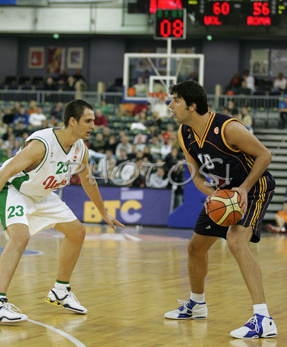 : Dejan Bodiroga (no 10) of Lottomatica Roma (R) and Domen Lorbek (no. 23) of Union Olimpija (L) during match of Euroleague League between KK Union Olimpija, Ljubljana, Slovenia and Lottomatica Roma, Italy. Match ended with victory of Union Olimpija, who defeated Lottomatica Roma with 82-73. Match between KK Union Olimpija and Lottomatica Roma was played in Tivoli hall in Ljubljana, Slovenia on 1. November 2006.