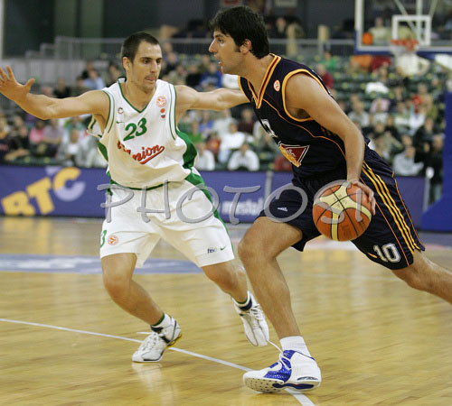 Ljubljana ,Slovenia - 01.11.2006 : Dejan Bodiroga (no 10) of Lottomatica Roma (R) and Domen Lorbek (no. 23) of Union Olimpija (L) during match of Euroleague League between KK Union Olimpija, Ljubljana, Slovenia and Lottomatica Roma, Italy. Match ended with victory of Union Olimpija, who defeated Lottomatica Roma with 82-73. Match between KK Union Olimpija and Lottomatica Roma was played in Tivoli hall in Ljubljana, Slovenia on 1. November 2006. Photo by: Primoz Jeroncic/PhotoSI