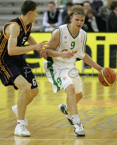 : Teemu Rannikko (no. 9) of Union Olimpija (R) and Vlado Ilievski (no 6) of Lottomatica Roma (L) during match of Euroleague League between KK Union Olimpija, Ljubljana, Slovenia and Lottomatica Roma, Italy. Match ended with victory of Union Olimpija, who defeated Lottomatica Roma with 82-73. Match between KK Union Olimpija and Lottomatica Roma was played in Tivoli hall in Ljubljana, Slovenia on 1. November 2006.
