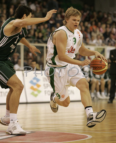 : Teemu Rannikko (no. 9) of Union Olimpija (R) and Dimitrios Diamantidis (no. 13) of Panathinaikos (L) during match of Euroleague League between KK Union Olimpija, Ljubljana, Slovenia and Panathinaikos Athens, Greece. Match ended with victory of Panathinaikos, who defeated Union Olimpija with 86:65. Match between KK Union Olimpija and Panathinaikos was played in Tivoli hall in Ljubljana, Slovenia on 8. November 2006.