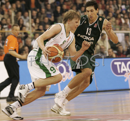 : Teemu Rannikko (no. 9) of Union Olimpija (L) and Dimitrios Diamantidis (no. 13) of Panathinaikos (R) during match of Euroleague League between KK Union Olimpija, Ljubljana, Slovenia and Panathinaikos Athens, Greece. Match ended with victory of Panathinaikos, who defeated Union Olimpija with 86:65. Match between KK Union Olimpija and Panathinaikos was played in Tivoli hall in Ljubljana, Slovenia on 8. November 2006.