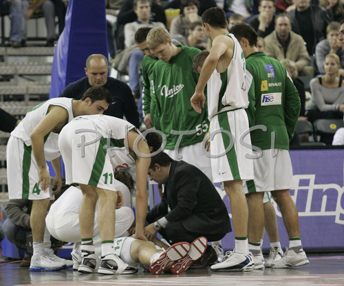 : Saulius Kuzminskas (no. 14) of Union Olimpija is laying on floor after getting injured during match of 5th round of Basketball Euroleague League between KK Union Olimpija, Ljubljana, Slovenia and Partizan Belgrade, Serbia. Match ended with victory of Partizan, who defeated Union Olimpija with 70:71. Match between KK Union Olimpija and Partizan was played in Tivoli hall in Ljubljana, Slovenia on 22. November 2006.