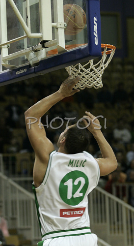 : Marko Milic (no. 12) of Union Olimpija during match NLB League between KK Union Olimpija, Ljubljana, Slovenia and Split Osiguranje, Croatia. Match ended with victory of Union Olimpija, who defeated Split Osiguranje with 85:71. Match between KK Union Olimpija and Split Osiguranje was played in Tivoli hall in Ljubljana, Slovenia on 25. November 2006.