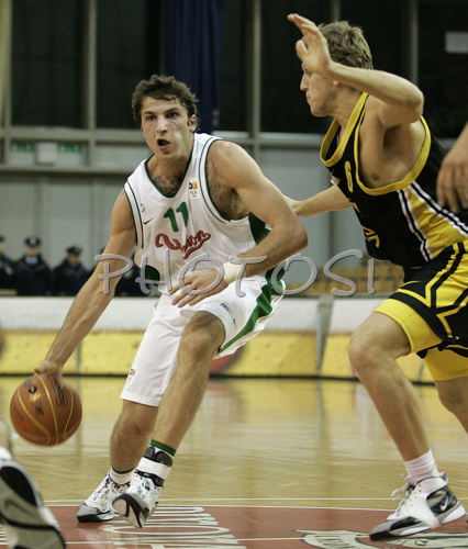 : Manuchar Markoishvili (no. 11) of Union Olimpija (L) during match NLB League between KK Union Olimpija, Ljubljana, Slovenia and Split Osiguranje, Croatia. Match ended with victory of Union Olimpija, who defeated Split Osiguranje with 85:71. Match between KK Union Olimpija and Split Osiguranje was played in Tivoli hall in Ljubljana, Slovenia on 25. November 2006.