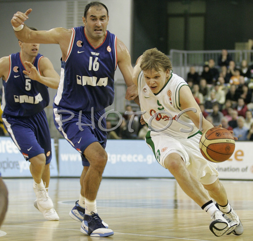 : Teemu Rannikko (no. 9) of Union Olimpija (R) and Jurica Zuza (no.16) of Cibona (L) during match of 8th round of Basketball Euroleague League between KK Union Olimpija, Ljubljana, Slovenia and Cibona Zagreb, Croatia . Match ended with victory of Union Olimpija, who defeated Cibona with 92:88. Match between Union Olimpija and Cibona was played in Tivoli Arena in Ljubljana, Slovenia on 14. December 2006.
