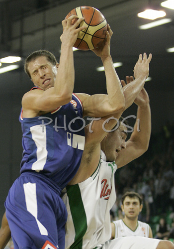 : Davor Kus (no.5) of Cibona (L) and Marko Milic (no. 12) of Union Olimpija jumping for ball during match of 8th round of Basketball Euroleague League between KK Union Olimpija, Ljubljana, Slovenia and Cibona Zagreb, Croatia . Match ended with victory of Union Olimpija, who defeated Cibona with 92:88. Match between Union Olimpija and Cibona was played in Tivoli Arena in Ljubljana, Slovenia on 14. December 2006.