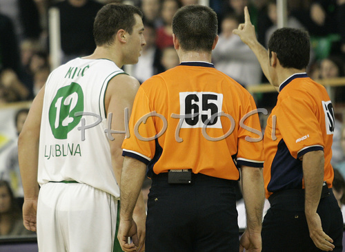 : Marko Milic (no. 12) of Union Olimpija arguing with referees before he got technical fault during match of 8th round of Basketball Euroleague League between KK Union Olimpija, Ljubljana, Slovenia and Cibona Zagreb, Croatia . Match ended with victory of Union Olimpija, who defeated Cibona with 92:88. Match between Union Olimpija and Cibona was played in Tivoli Arena in Ljubljana, Slovenia on 14. December 2006.