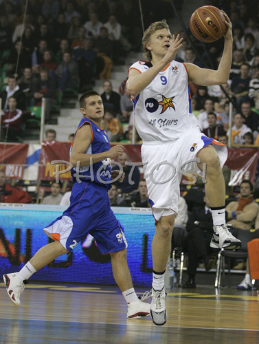 : Teemu Rannikko (no.9) of West ALL Stars team (R) scoring during first NLB league ALL Stars match. Match ended with victory of West All Stars team, who defeated East All Stars team with 134:118. First NLB League All Stars match was played in Tivoli Arena in Ljubljana, Slovenia on 27. December 2006.