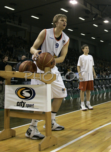 : Winner Teemu Rannikko (no.9) of West ALL Stars team during 3-pointers competition of first NLB league ALL Stars match. Match ended with victory of West All Stars team, who defeated East All Stars team with 134:118. First NLB League All Stars match was played in Tivoli Arena in Ljubljana, Slovenia on 27. December 2006.