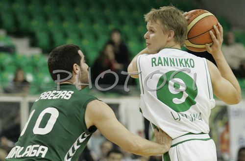 : Teemu Rannikko (no. 9) of Union Olimpija (R) and Carlos Cabezas (no.10) of Unicaja (L) during match of 11th round of Basketball Euroleague League between KK Union Olimpija, Ljubljana, Slovenia and Unicaja, Malaga, Spain. Match ended with victory of Union Olimpija, who defeated Unicaja with 87:59. Match between KK Union Olimpija and Unicaja was played in Tivoli Arena in Ljubljana, Slovenia on 10. January 2007.