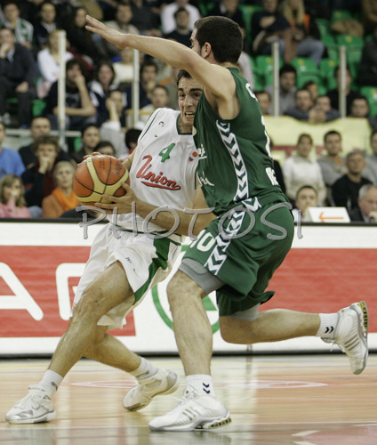 : Ender Arslan (no. 4) of Union Olimpija (L) and Carlos Cabezas (no.10) of Unicaja (R) during match of 11th round of Basketball Euroleague League between KK Union Olimpija, Ljubljana, Slovenia and Unicaja, Malaga, Spain. Match ended with victory of Union Olimpija, who defeated Unicaja with 87:59. Match between KK Union Olimpija and Unicaja was played in Tivoli Arena in Ljubljana, Slovenia on 10. January 2007.