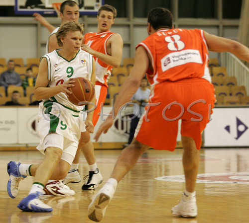 : Teemu Rannikko (no. 9) of Union Olimpija (L), Marko Milic (no. 12) of Union Olimpija (white M) and Predrag Suput (no. 8) of Hemofarm (R) during match of NLB League between KK Union Olimpija, Ljubljana, Slovenia and KK Hemofarm, Vrsac, Serbia. Match ended with victory of Hemofarm, who defeated Union Olimpija with 68:73. Match between KK Union Olimpija and KK Hemofarm was played in Tivoli hall in Ljubljana, Slovenia on 21. October 2006.