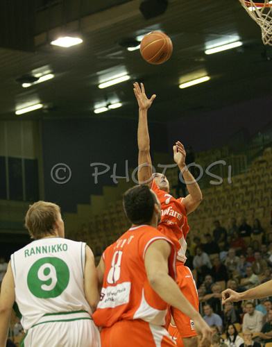 Ljubljana ,Slovenia - 21.10.2006 : Nebojsa Joksimovic (no. 7) of Hemofarm jumping for ball while Teemu Rannikko (no. 9) of Union Olimpija (L) and Predrag Suput (no. 8) of Hemofarm waiting for result, during match of NLB League between KK Union Olimpija, Ljubljana, Slovenia and KK Hemofarm, Vrsac, Serbia. Match ended with victory of Hemofarm, who defeated Union Olimpija with 68:73. Match between KK Union Olimpija and KK Hemofarm was played in Tivoli hall in Ljubljana, Slovenia on 21. October 2006. Photo by: Primoz Jeroncic/PhotoSI