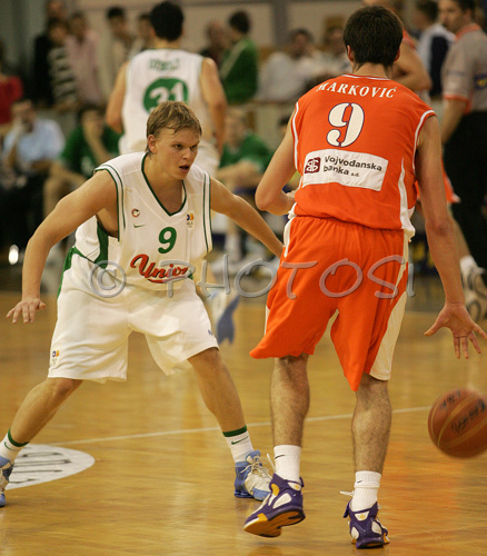 : Teemu Rannikko (no. 9) of Union Olimpija (L) and Stefan Markovic (no. 9) of Hemofarm (R) during match of NLB League between KK Union Olimpija, Ljubljana, Slovenia and KK Hemofarm, Vrsac, Serbia. Match ended with victory of Hemofarm, who defeated Union Olimpija with 68:73. Match between KK Union Olimpija and KK Hemofarm was played in Tivoli hall in Ljubljana, Slovenia on 21. October 2006.