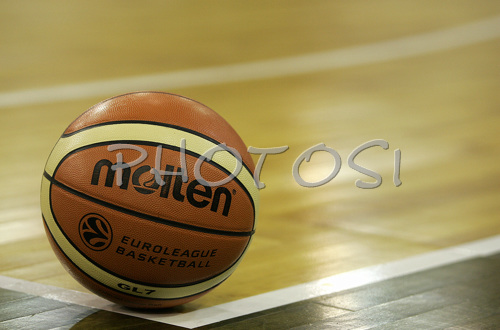 : Official ball of Euroleague resting on field before start of match of 13th round of Basketball Euroleague League between KK Union Olimpija, Ljubljana, Slovenia and Maccabi Elite, Tel Aviv, Israel. Match ended with victory of Union Olimpija, who defeated Maccabi Elite with 77:75. Match between KK Union Olimpija and Maccabi Elite was played in Tivoli Arena in Ljubljana, Slovenia on 25. January 2007.
