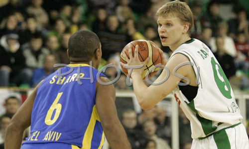 : Teemu Rannikko (no.9) of Union Olimpija (R) and Derrick Sharp (no.6) of Maccabi Elite (L) during match of 13th round of Basketball Euroleague League between KK Union Olimpija, Ljubljana, Slovenia and Maccabi Elite, Tel Aviv, Israel. Match ended with victory of Union Olimpija, who defeated Maccabi Elite with 77:75. Match between KK Union Olimpija and Maccabi Elite was played in Tivoli Arena in Ljubljana, Slovenia on 25. January 2007.